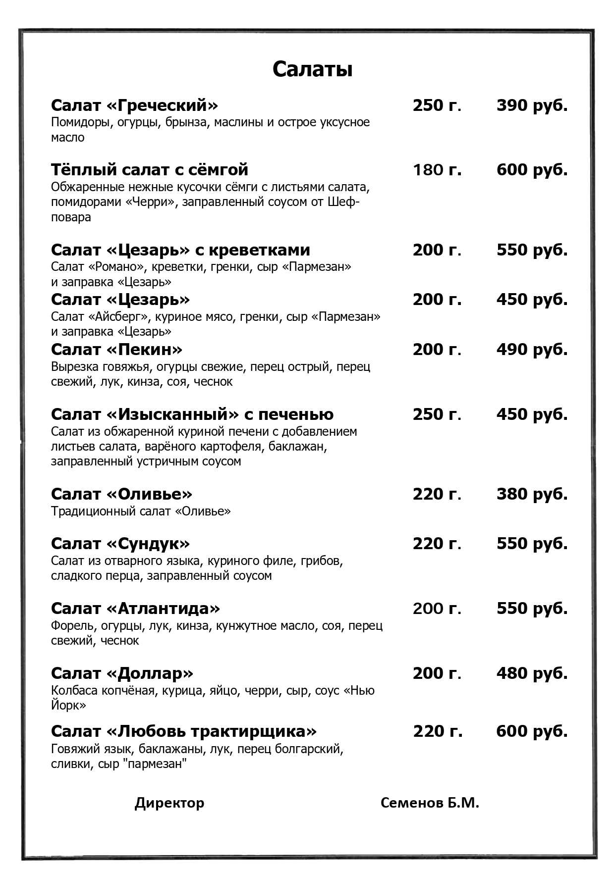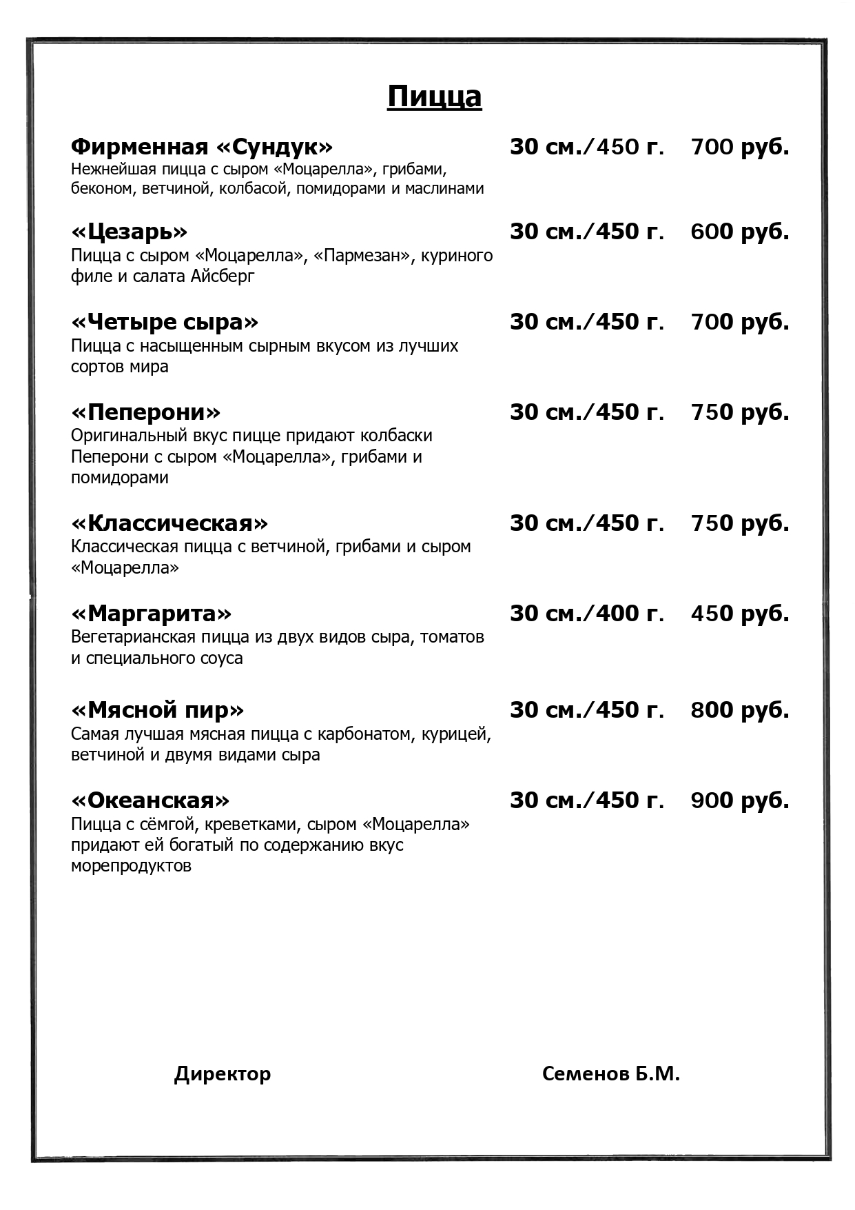 Добро пожаловать на страницу меню нашего кафе "Сундук" – места, где встречаются традиции и современные кулинарные тренды. Здесь вы найдете изысканные блюда русской и европейской кухни, приготовленные с любовью и мастерством наших поваров.