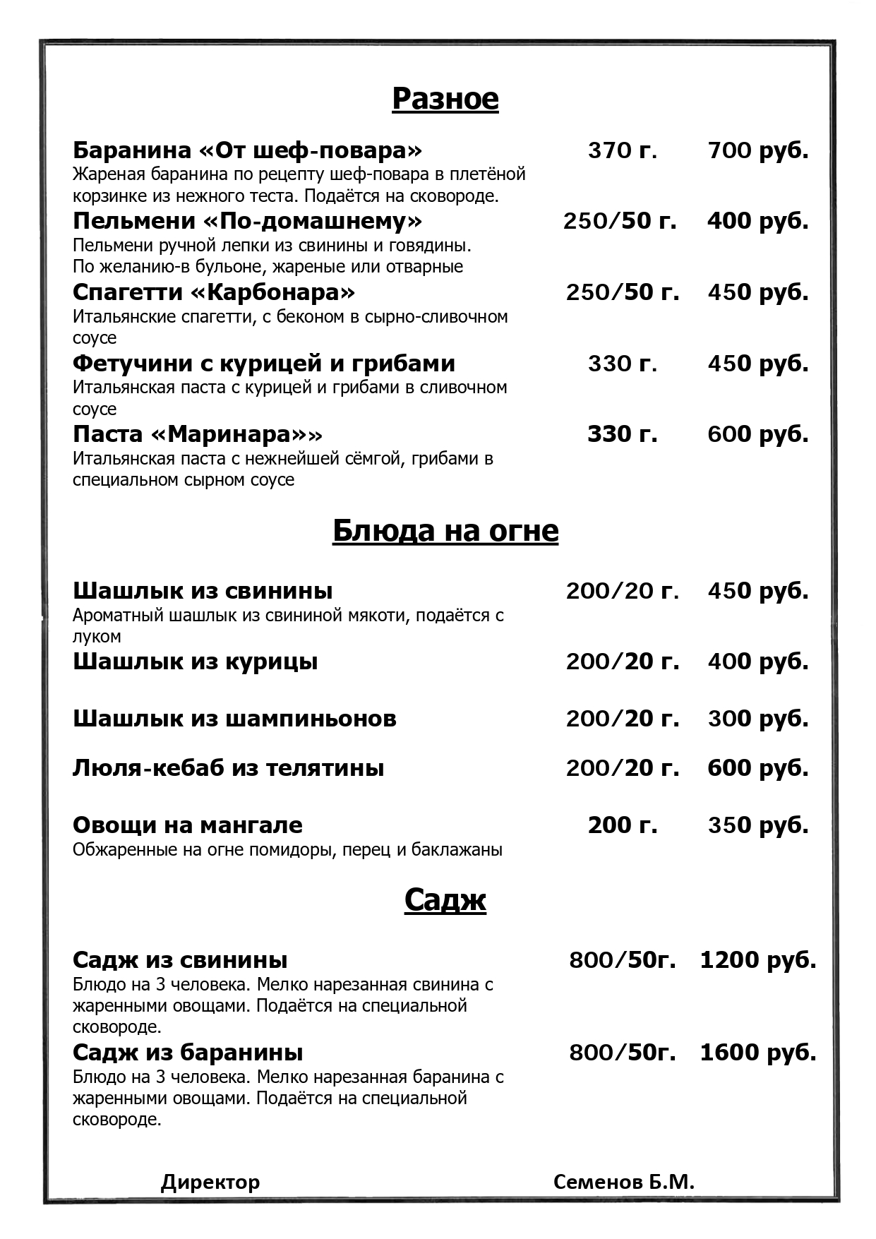 Шашлык на мангале: Наш фирменный шашлык, приготовленный на открытом мангале, – это настоящее удовольствие для гурманов. Маринованное мясо до совершенства, обладающее неповторимым ароматом и вкусом, обязательно станет вашим фаворитом!